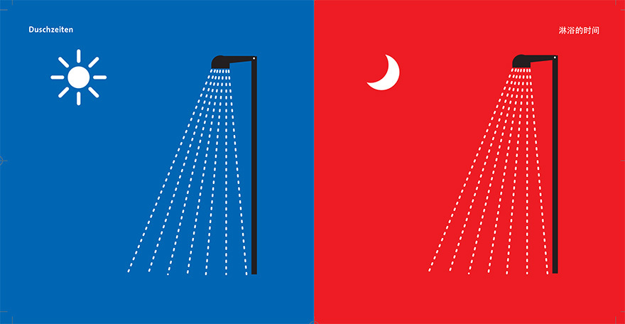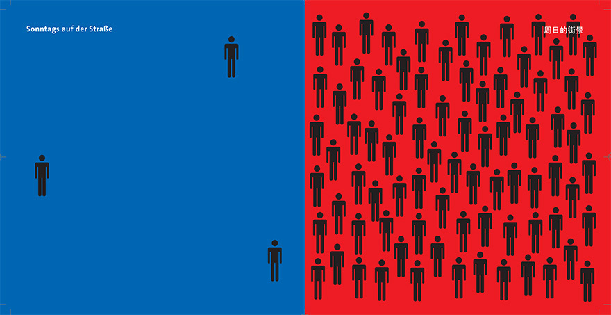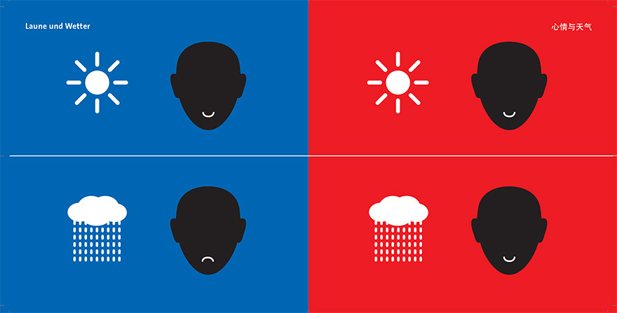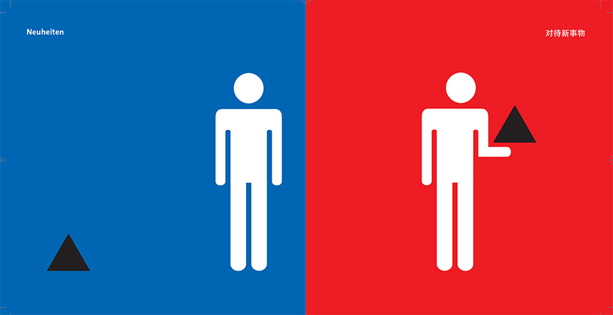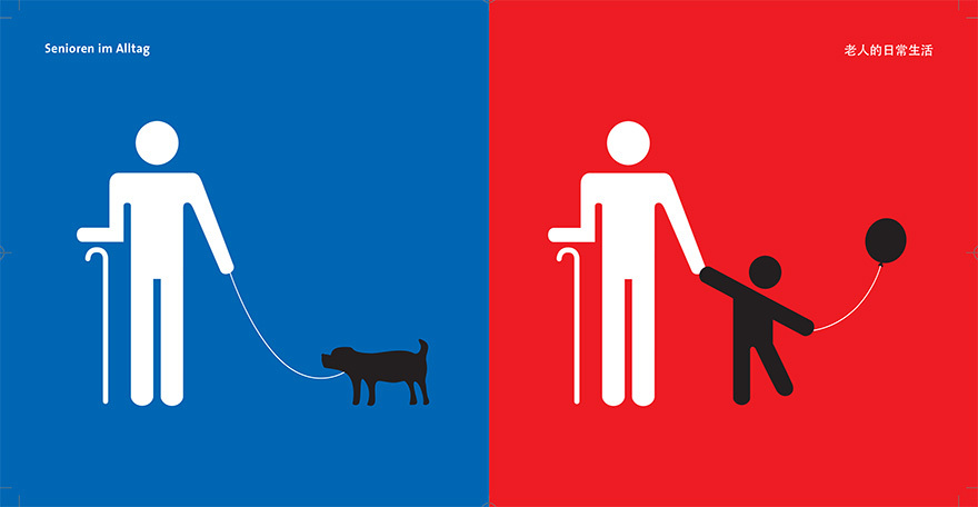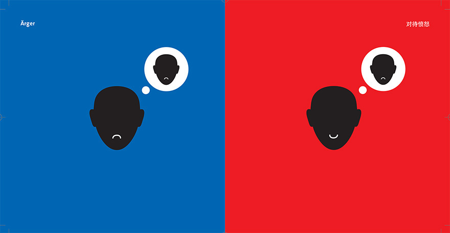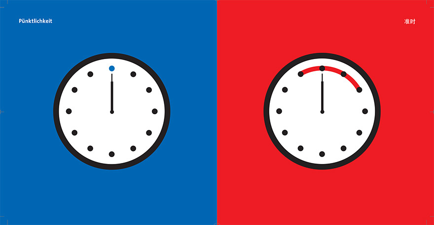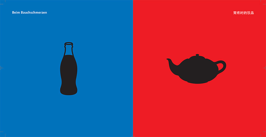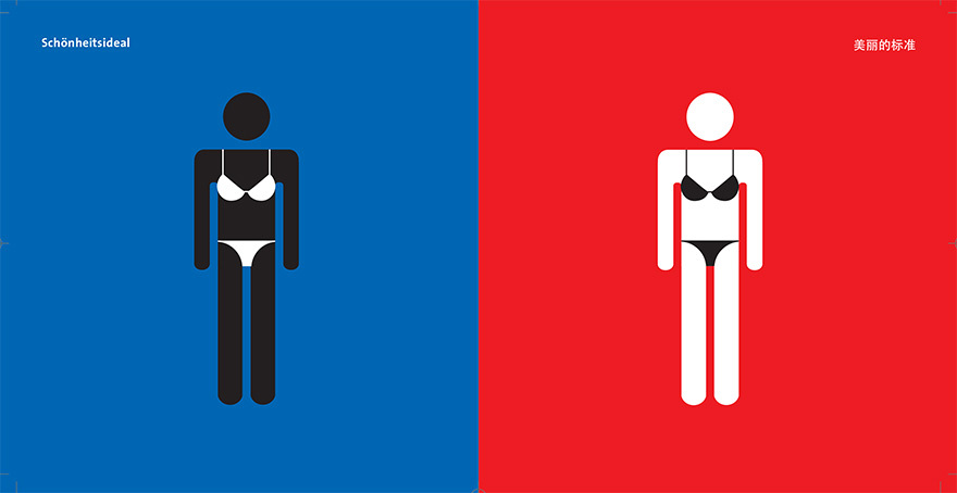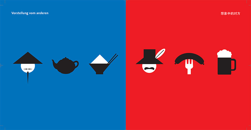 这是一组关于中德文化对比的作品,红色代表中国,蓝色代表德国。艺术家运用简洁而又形象的画面轻松幽默地展示了东西文化差异。