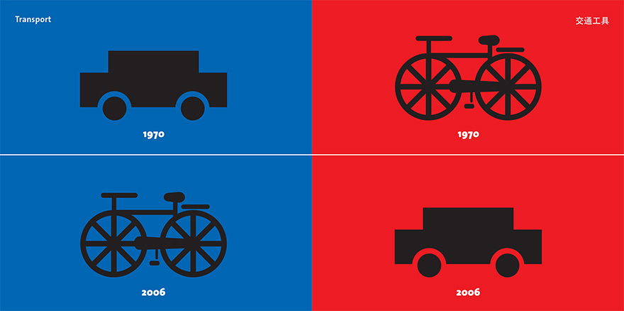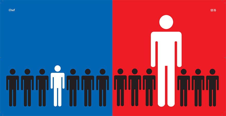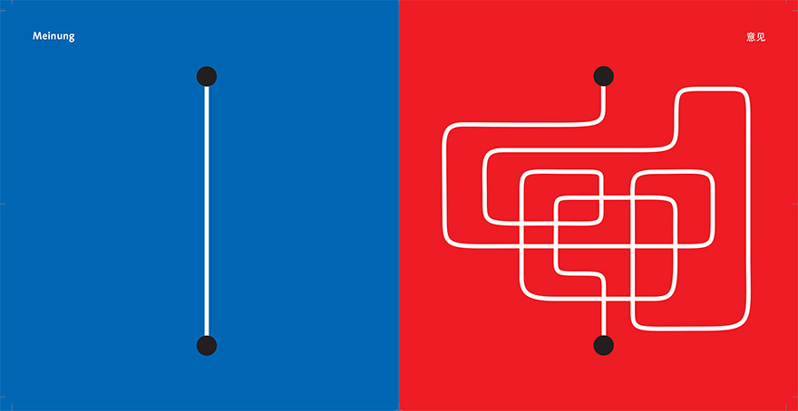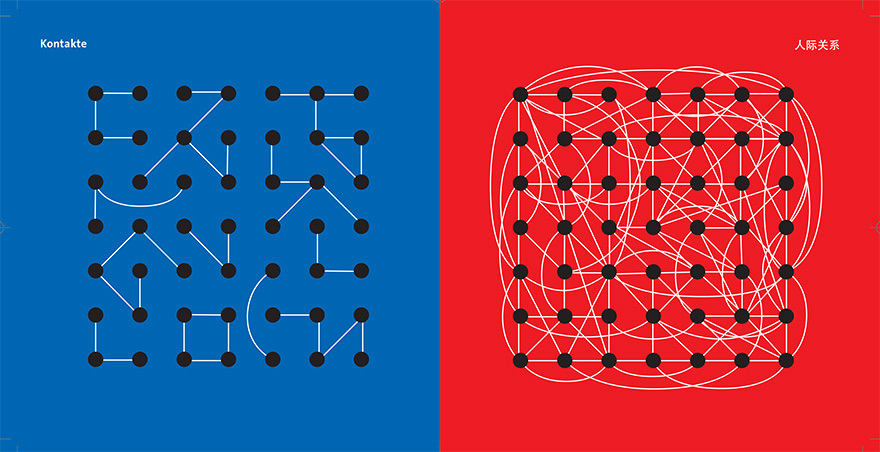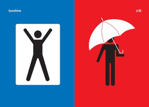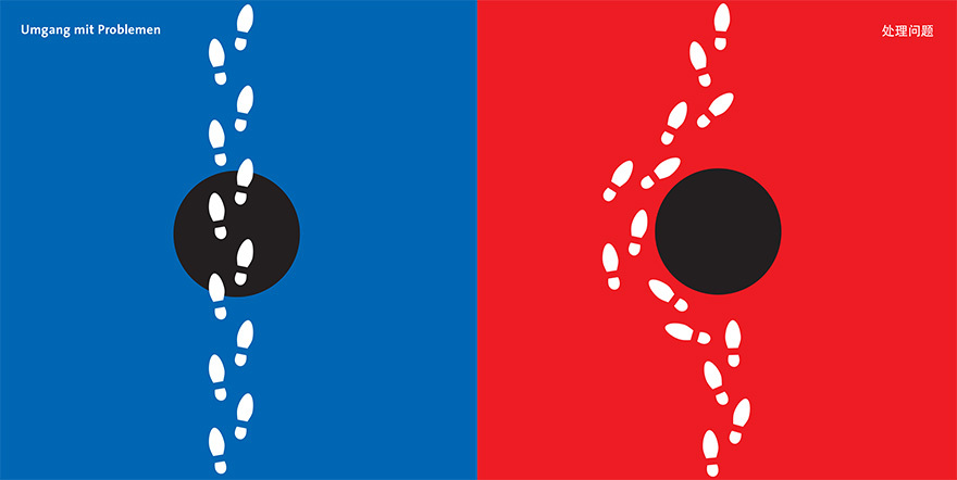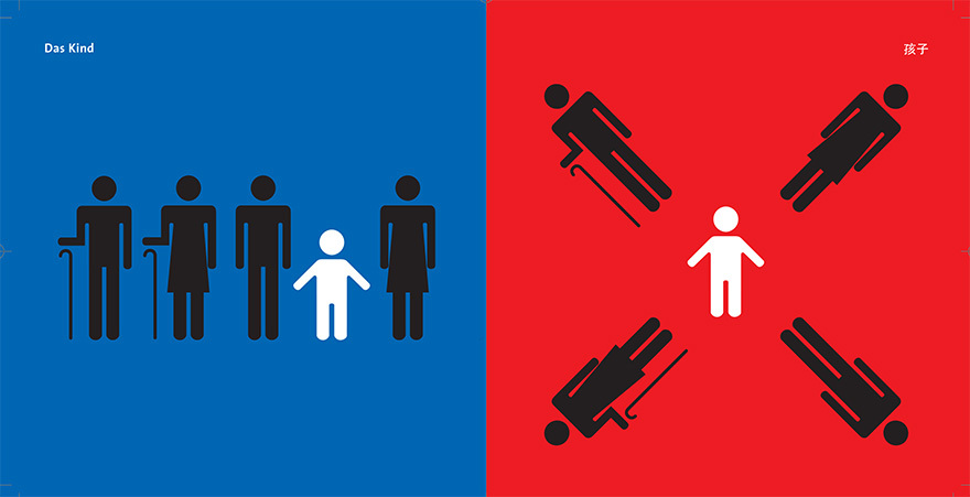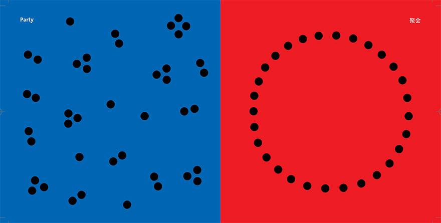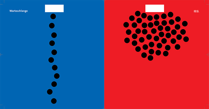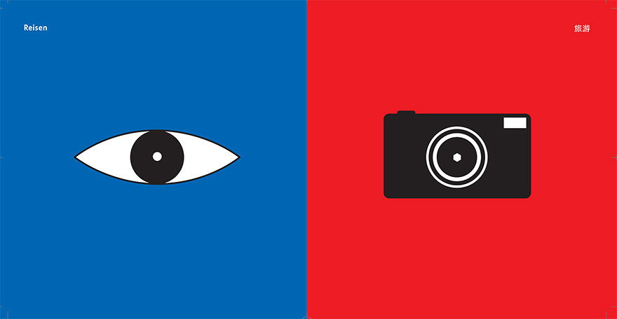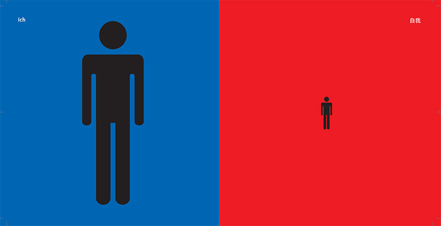 这是一组关于中德文化对比的作品,红色代表中国,蓝色代表德国。艺术家运用简洁而又形象的画面轻松幽默地展示了东西文化差异。