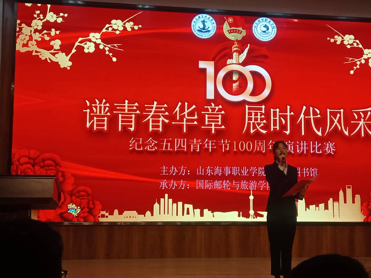 为弘扬五四精神,展现当代大学生青春风采,山东海事职业学院于5月7日在图书馆报告厅举办以“谱青春华章 展时代风采”为主题的纪念五四爱国100周年演讲比赛。出席本次活动的嘉宾有各二级学院团总支书记以及基础部老师,参与人员为全院师生。