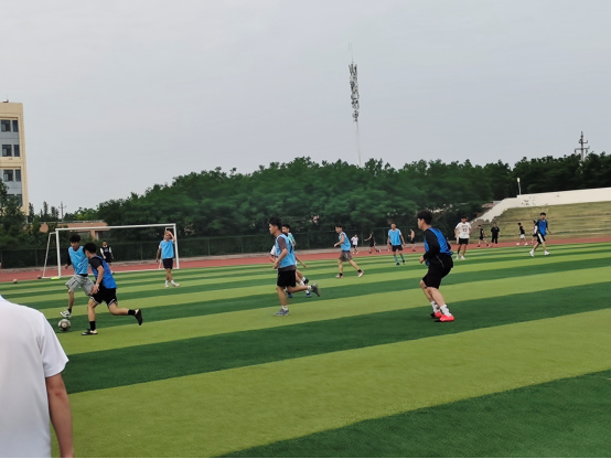 中场休息时,我院观众毫不吝啬的为各位参赛队员献出了欢呼和掌声,这是他们应得的荣耀。任明飞老师肯定了他们在上半场的努力,并希望下半场他们能再接再厉,继续保持领先。队长也根据上半场的形势进行了战术调整。休息过后,双方又进行了后半场的激烈鏖战。面对对手的强烈攻势,我院的后防线就像一堵难以逾越的城墙,完美的拦下了所有的进攻。双方展开了对攻模式,运动员们奋力拼搏,奔跑如离弦之箭,喊声振奋人心,青春的活力在绿茵场.上肆意的绽放。虽然场上双方都贡献了数次精彩的打门,最后一球由我院学子,精准射门将比赛拉下来序幕。
