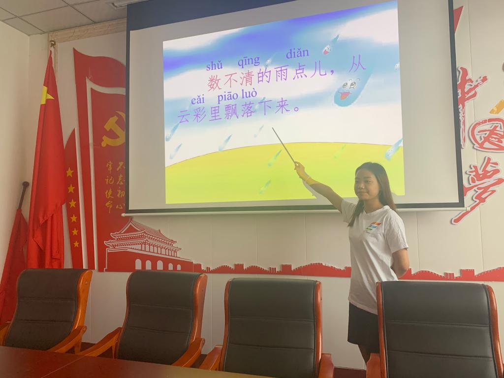 图为志愿者李恩洁在给同学们上语文课。中国青年通讯员杜英德摄。