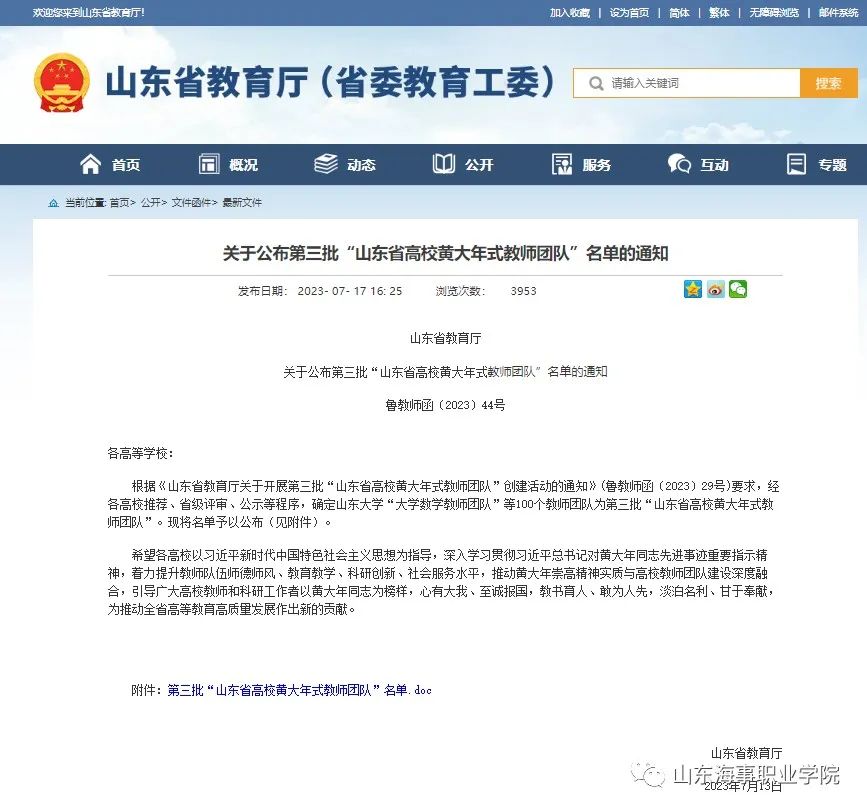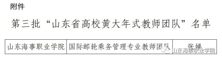 近日,山东省教育厅公布第三批“山东省高校黄大年式教师团队”名单,本次全省共评出本科和高职院校的100个教学团队,其中高职高专院校48个教学团队入选。我校邮轮游艇学院“国际邮轮乘务管理专业教师团队”成功获批为第三批“山东省高校黄大年式教师团队”。