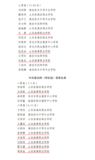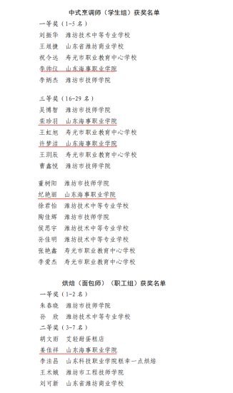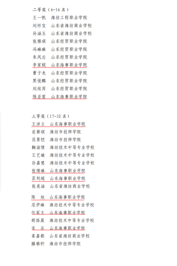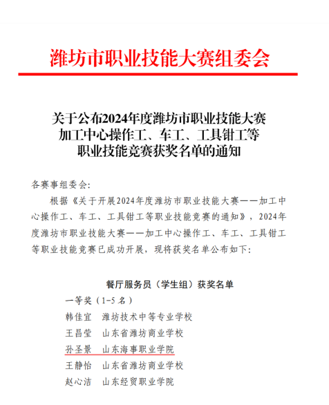 近日,潍坊市人力资源和社会保障局发布了《关于公布2024年度潍坊市职业技能大赛加工中心操作工、车工、工具钳工等职业技能竞赛获奖名单的通知》,我校邮轮游艇学院师生凭借出色的专业技能,共摘得24项奖项,具体获奖名单如下: