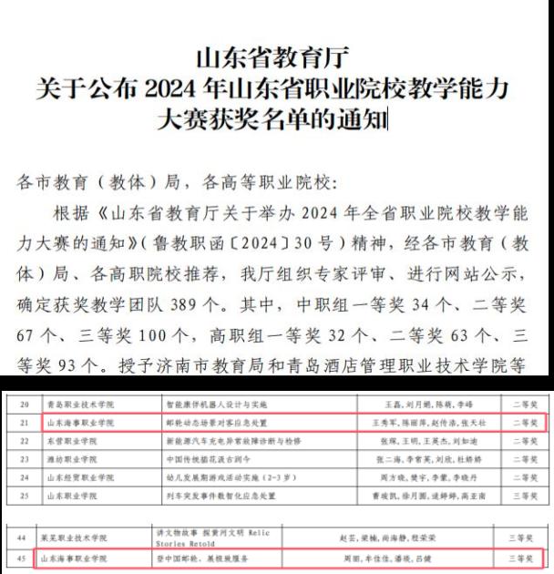 2月,学院党支部书记、院长张娣获评“山东省高等学校教学名师”;3月,刘乐鑫老师获评2023年“山东高校优秀辅导员”荣誉称号;6月,张雪妍老师获得第十一届青年教师教学比赛三等奖;9月,王秀军、陈丽萍老师团队,周丽、牟佳佳团队分别荣获山东省职业院校教学能力大赛二等奖、三等奖。教师参加行业协会等其他各类比赛获奖17项。