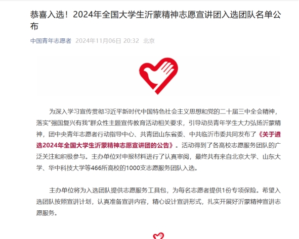 学院将社会实践与学生第二课堂相结合,开展旅游扶贫、电商助农、理论政策宣讲、法制宣传等活动30余场。4月,“星愿”乡村振兴服务队荣获“优秀服务团队”,刘乐鑫老师荣获“优秀指导教师”。社会实践团队荣获2023年“潍坊市青年志愿服务先进集体”,团总支荣获2023年“潍坊市五四红旗团总支”。11月,“星愿”志愿服务队入选2024年团中央全国大学生沂蒙精神志愿宣讲团。