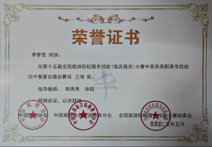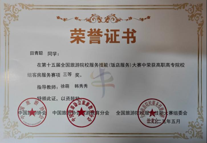 赛事设置西餐宴会摆台、中餐宴会摆台、鸡尾酒调制和客房服务四个项目,通过理论考核、实操测评和英语水平测试综合检验学生能力。我院通过校赛选拔2名选手参赛,最终斩获高职组三等奖2项(客房服务田青聪、中餐宴会摆台李梦雪)。
