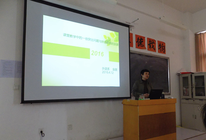 2016年4月13日下午3时,外语系、旅游管理系全体教师在1215教室举行了本学期系部开学以来的第一次专业讲座。题目是:“课堂教学的一些突出问题和教师发展”。由系部主任金丽教授主讲。