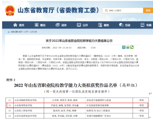 山东省职业院校教学能力大赛是由山东省教育厅主办,是山东省职业院校教师教学能力方面的高水平权威赛事,全省122所中职学校和77所高职院校参加比赛,经网络初评、组织决赛,评出获奖作品358件,其中中职组一等奖26件、高职组一等奖34件。